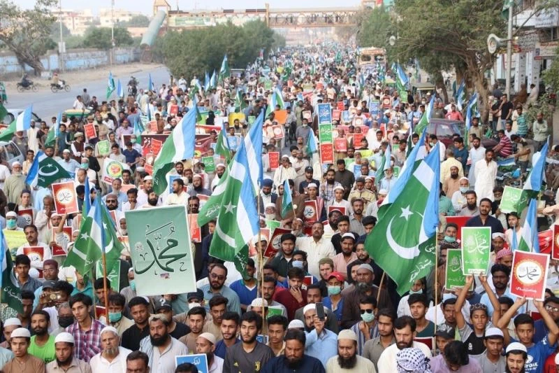 Fransa’da Hz. Muhammed’e karşı yapılan küstah karikatürlere ve Fransa Cumhurbaşkanı Emmanuel Macron’un İslam karşıtı açıklamalarına Müslümanların tepkiler sürüyor. Pakistan’ın Karaçi kentindeki Fransa Konsolosluğu’na yakın bir bölgede bir araya gelen binlerce kişi Fransa karşıtı protesto düzenledi.