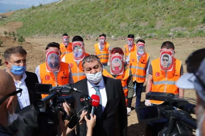 PALTİM görevlileri, aralarında Trabzon’da şehit olan Eren Bülbül, Ankara’da 15 Temmuz Şehidi Abdullah Tayyip Olçok, Ağrı’da kaybolduktan 18 gün sonra cansız bedeni bulunan Leyla Aydemir, Kars’ta kafası taşla ezilerek öldürülen Sedanur Güzel gibi ölümüyle Türkiye’yi derinden sarsan 11 çocuğun fotoğrafının bulunduğu maskeleri takarak, ağaç dikimini gerçekleştirdi.