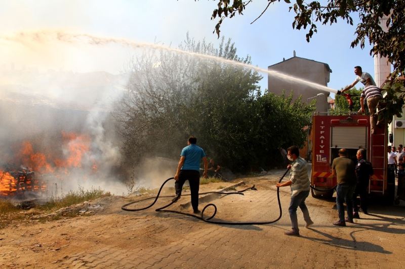 Manisa’nın Kula ilçesinde boş bir arsadaki üst üste yığılmış paletlerden çıkan yangın, boş bir deponun çatısına da sıçradı. Çevredeki iş yeri ve evlere sıçramadan kontrol altına alınan yangında soğutma çalışmalı sürüyor.