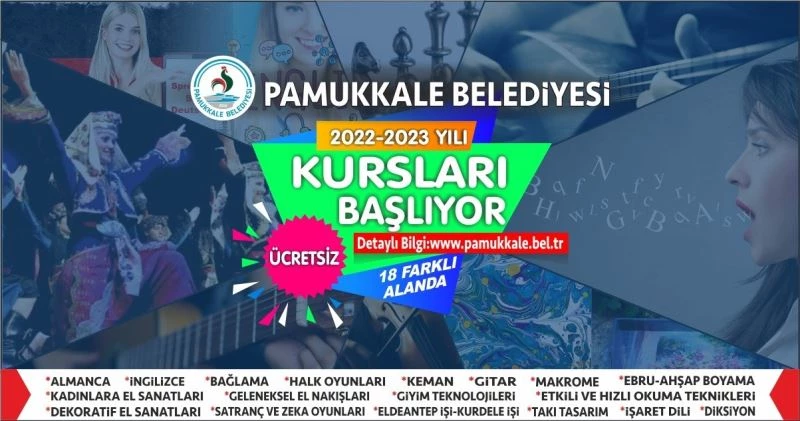 Pamukkale Belediyesi tarafından bu dönem 18 farklı alanda kurs açılacak. Almanca ve İngilizce içerikli yabancı dil kurslarının yanı sıra bağlama, halk oyunları, keman, gitar, makrome, ebru-ahşap boyama, kadınlara yönelik el sanatları, geleneksel el nakışları, giyim teknolojileri, etkili ve hızlı okuma teknikleri, dekoratif el sanatları, satranç ve zeka oyunları, elde antep işi-kurdele işi, takı tasarım, işaret dili, diksiyon alanlarında açılacak olan kurslara başvurular başladı. Kurslar, Pamukkale Belediyesi’nin Atatürk Caddesi üzerindeki ek binasında gerçekleşecek. Ayrıca mahalle sakinlerinin yoğun talebi üzerine Fatih Kapalı Pazar Yeri’nde de ve Yunus Emre Mahalle Konağı’nda da el sanatları kursları açılacak.