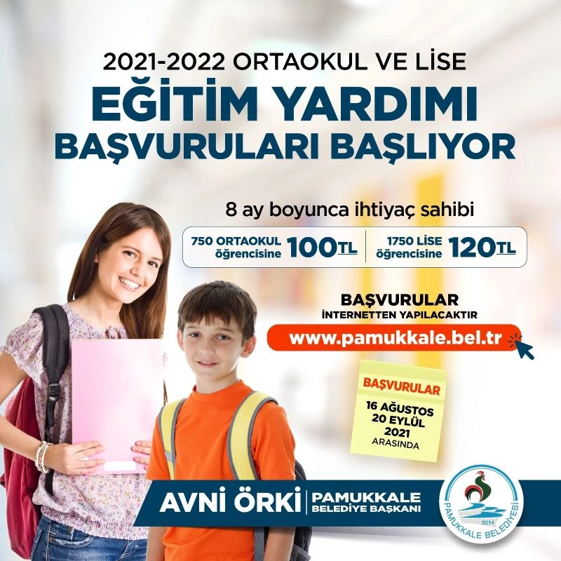 Pamukkale Belediyesi, eğitim alanındaki yatırımlarının yanı sıra eğitim yardımı ile de hem öğrencilerin hem de velilerin destekçisi olmayı bu yıl da sürdürüyor. Pamukkale Belediyesinin 16 Ağustos 2021 tarihinde başlayan eğitim yardımı başvuru süresi 20 Eylül 2021 tarihinde sona erecek. Ortaokul ve lise öğrencisi olmak üzere toplam 2 bin 500 öğrenciye, 8 ay boyunca eğitim yardımı yapılacak.
