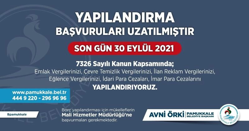 Pamukkale Belediyesi, vatandaşların emlak, çevre temizlik, ilan-reklam, eğlence vergileri ile idari ve imar para cezalarını yapılandırma süresinin uzatıldığını bildirdi.