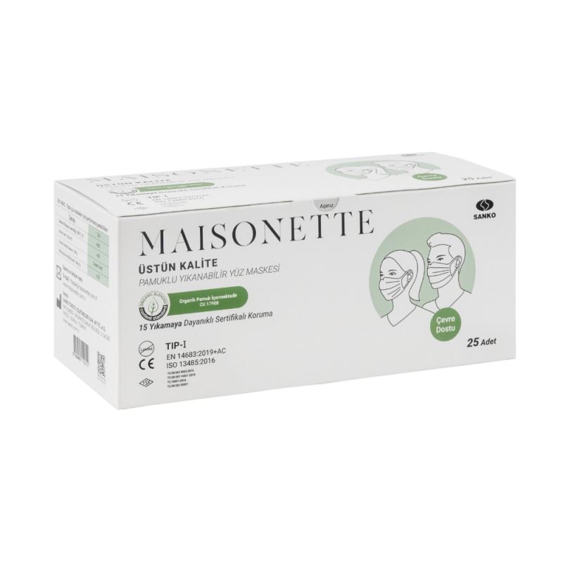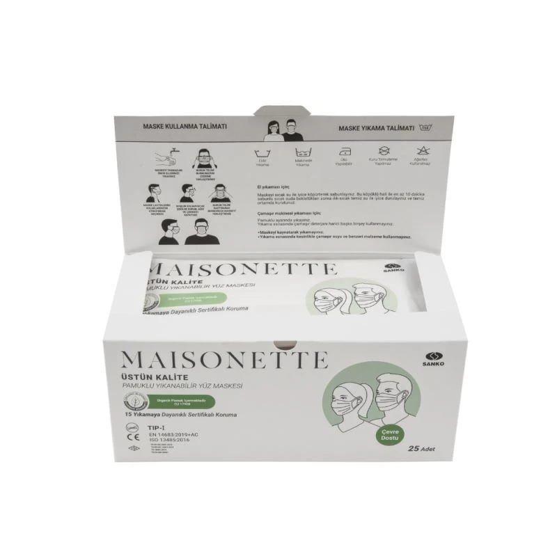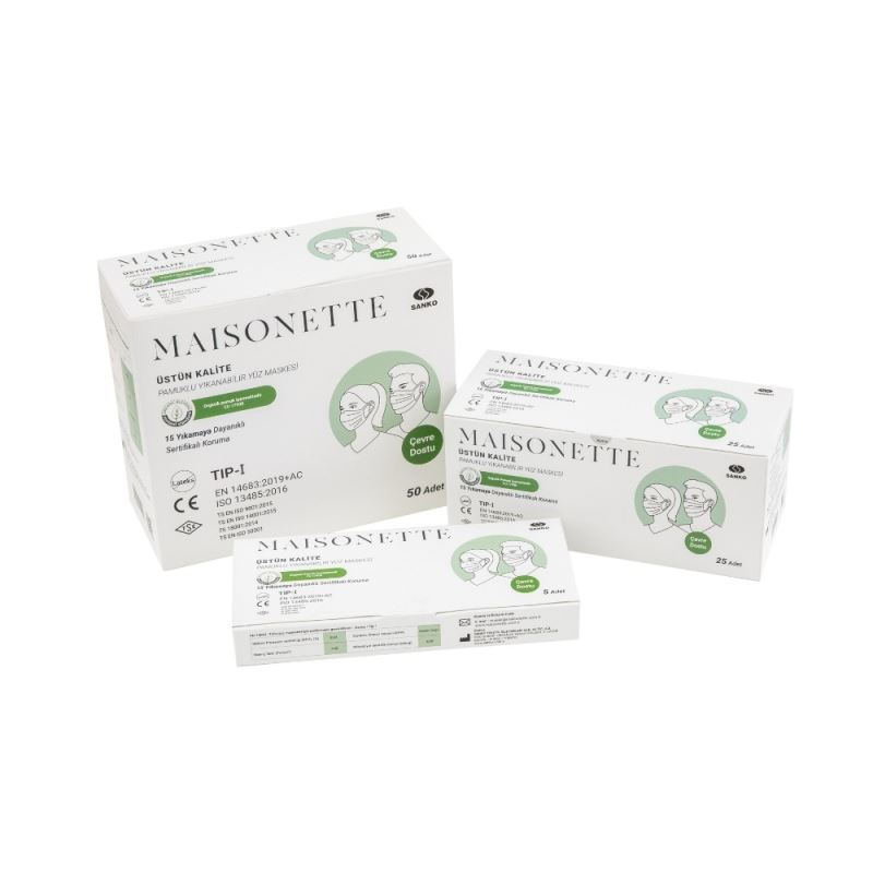 Maisonette pamuklu yıkanabilir yüz maskesi, Yeni Koronavirüs salgınına karşı alınan önlemlerle Türkiye’de TSE tarafından yapılan denetimler sonucu “TSE COVID-19 Güvenli Üretim Belgesi” verilen ilk şirket olan Sanko Tekstil İşletmeleri’nde üretiliyor. Sektör inovasyonlarına liderlik yapan Sanko Tekstil İşletmeleri’nde, doğaya ve insana saygılı, karbon ayak izi düşük üretim gerçekleştiriliyor.