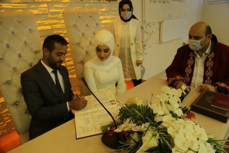 Erzurum’da pandemi yasakları nedeniyle uzun zamandır kapalı olan nikah taleplerinde aşırı yoğunluk yaşanıyor. Erzurum’da yerel ve ulusal televizyonlarda muhabirlik yapan daha sonra Aziziye Belediyesi Basın ve Halkla İlişkiler Müdürlüğü’nde görev alan gazeteci Adem Kotan, dünya evine girdi. Pandemi yeni normalleşme sonrası nikah salonlarının açılması ile ilk nikah Aziziye Belediyesi personeli Adem Kotan, iki yıldır nişanlı olduğu Derya Topçu ile nikah masasına oturdu.