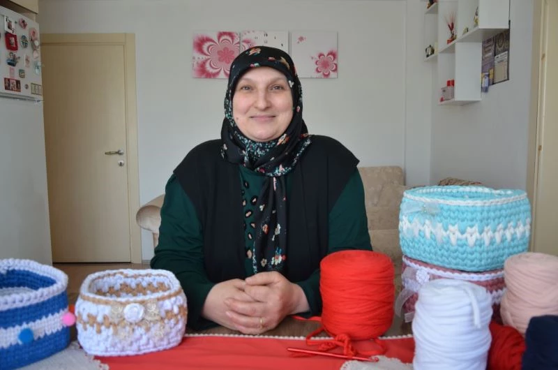 Kaledere Mahallesi’nde yaşayan 50 yaşındaki ev hanımı Serpil Küçük, salgın sonrası evinde başladığı el işi işlemeleri geliştirerek penye ipinden sepet yapmaya başladı. Çocuklarının ve eşinin de desteğini alan 2 çocuk annesi Serpil Küçük, şimdilerde ise el sanatını öğrenerek; komşularına, akrabalarına ve şehir dışından gelen siparişlerini yetiştiremiyor.