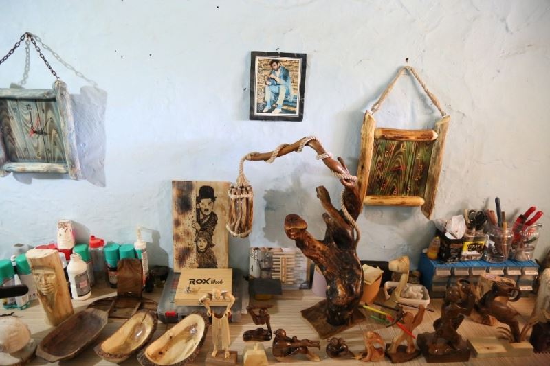 Antalya’da çalışırken 2 yıl önce memleketi Tunceli’nin Hozat ilçesine dönerek yerleşen Murat Göktaş (45), pandemi sürecini de fırsata çevirdi. Evinin depo olarak kullanılan bölümünü atölyeye çeviren Göktaş, hiç bir eğitim almadan dağlardan topladığı kuru meşe, kavak ve çam ağaç parçalarından ürünler yapmaya başladı. Dağ keçisinden, insan figürlerine kadar farklı farklı motifler yapan Göktaş, ürünlerini sosyal medyada kurduğu sayfa üzerinden satarak ekonomik gelir de elde etmeye başladı.