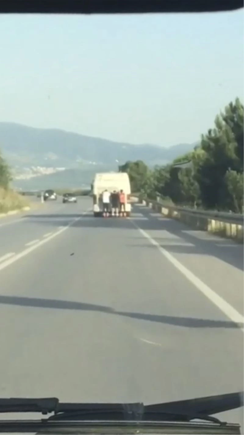 Bursa Gemlik Sahil Yolu’nda otobüsün arkasına takılarak yolculuk yapan patenci gençler adeta ölüme davetiye çıkardı.