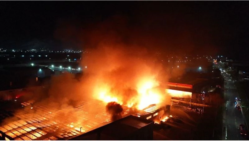 Parfüm depsunu saran yangın drone ile havadan da görüntülendi. Yangının etkisiyle fabrikanın duvarları, çatıları tamamen çökerken alevlerin arasında patlamalar halen devam ediyor.