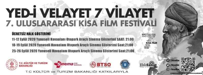 Kültür ve Turizm Bakanlığı katkılarıyla, Sinema Genel Müdürlüğü ve Bursa Ticaret ve Sanayi Odası’nın destekleriyle Ehli Sanat Sinema ve Kültür Derneği tarafından bu yıl yedincisi düzenlenen Uluslararası Yed-i Velayet 7 Vilayet Kısa Film Festivalinin ücretsiz halk gösterimleri Yunuseli Havalimanı’nda kurulan arabalı sinemada başlıyor.