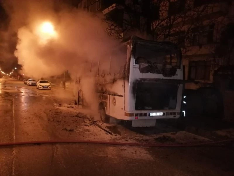 Servis otobüsünün park halinde yoğun alevli olarak yandığını gören itfaiye erleri, elektrik kontağından kaynaklandığı tahmin edilen yangını kısa sürede söndürdü.