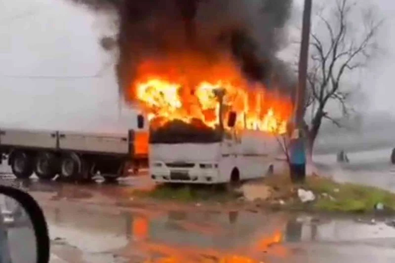 Zonguldak’ın Ereğli ilçesinde park halindeki minibüs alev alev yanarak hurdaya döndü.
