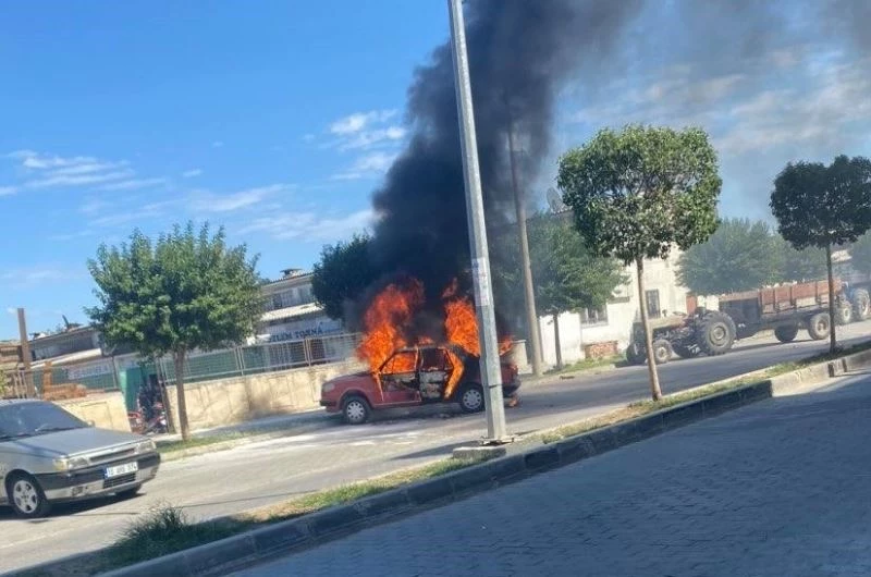 Balıkesir’in Burhaniye ilçesinde park halindeki bir otomobilde çıkan yangında alevlere teslim olan araç kullanılamaz hale geldi. O korku dolu anlar kameraya yansıdı.