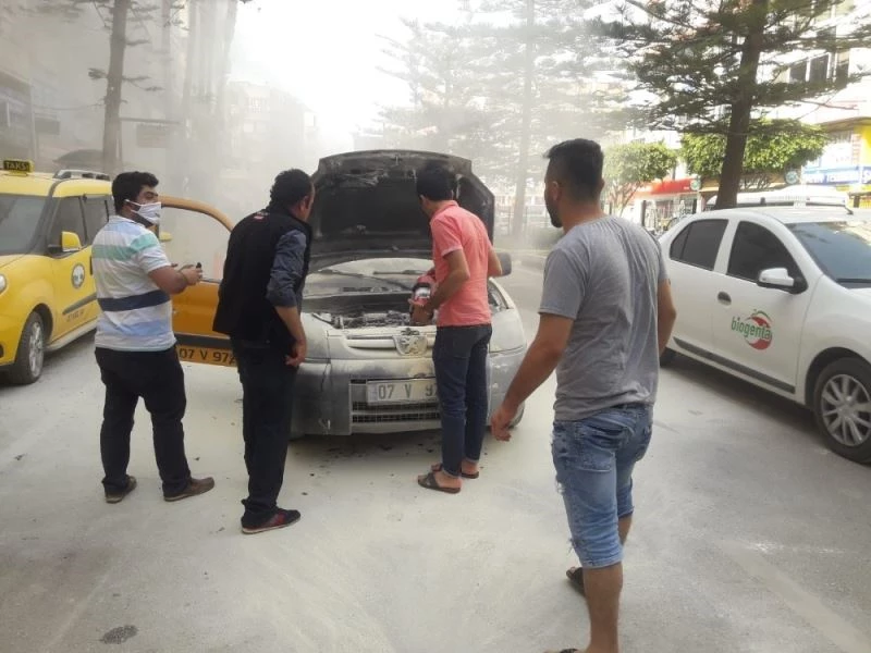 Antalya’da park halindeki taksi alev aldı. Çevredeki vatandaşların yangın tüpleriyle müdahale ettiği araç söndürüldü.