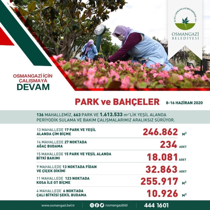 Yeni tip koronavirüs salgınına karşı ilçe genelinde seferberlik ilân eden Osmangazi Belediyesi, normalleşme sürecinde de park ve bahçelerde düzenli olarak bakım ile onarım yapıyor. İlk vak’anın görüldüğü 11 Mart tarihinden itibaren yoğun mesai harcayan belediye ekipleri, son 9 günde 663 park ve 1 milyon 613 bin 533 metrekare yeşil alanda periyodik sulama ile bakım çalışması yaptı. Ekipler, 246 bin 862 metrekarede çim biçerken, 234 adet ağaç budadı. Bunun yanı sıra 18 bin 081 bitkinin bakımını üstlenen Osmangazi Belediyesi Park ve Bahçeler Müdürlüğü, 13 noktada 32 bin 863 adet çiçek dikti. Çalışmalarını tamamlayana kadar sürdüreceklerini belirten ekipler, 255 bin 917 metrekarede kosa ile ot biçerken, 10 bin 926 metrekarede çalı bitkisi şekil budama yaptıklarını söyledi.