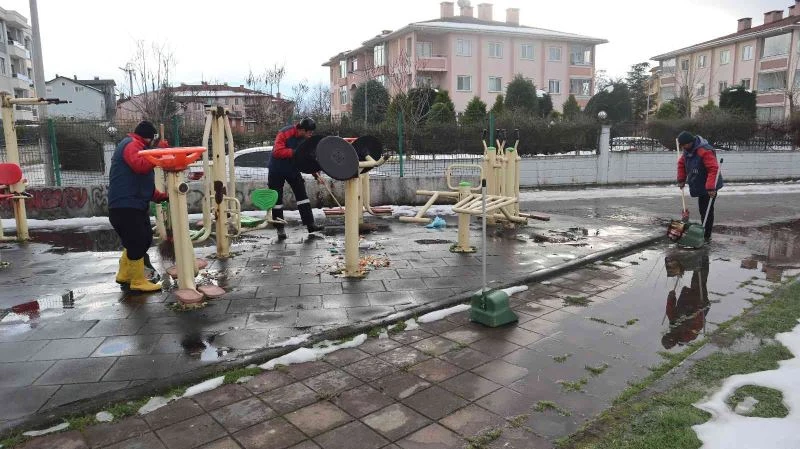 Düzce Belediyesi, yoğun kar yağışının ardından şehir genelindeki parklarda başlattığı bakım, onarım ve temizlik çalışmalarına birçok noktada devam ediyor.