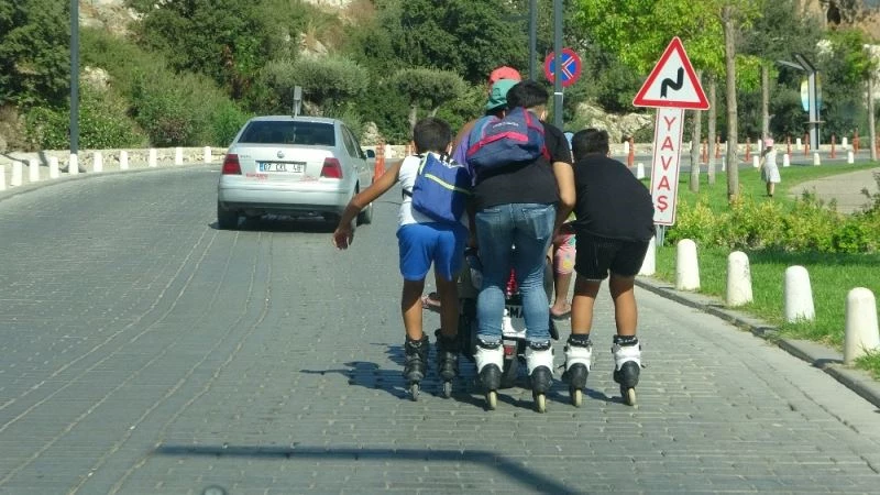 Olay, Konyaaltı sahilinden Konyaaltı Caddesi’ne çıkışın olduğu virajlı çift yönlü yolda meydana geldi. Sahilden arkasına bindirdiği yolcuyla gitmek için hazırlanan motosiklet sürücüsü, yokuşu çıkmak için yardım isteyen 3 patenli çocuğun motosikletine tutunmasına müsaade etti. Yaklaşık 250 metrelik mesafeyi motosiklete tutunarak giden çocuklar, zaman zaman düşme tehlikesi yaşadı. Yokuşu çıkan çocuklar ardından motosikletten ayrılıp yollarına paten sürerek devam etti.
