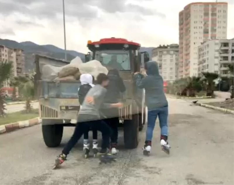 Edinilen bilgiye göre, Osmaniye’nin Düziçi’nde ilçesinde bulunan bir caddede seyir halinde ilerleyen traktörün römorkuna tutunan patenli 4 genç trafikte tehlike oluşturdu. Seyir halindeki bir başka sürücü tarafından görüntüleri çekilen patenli gençlerin bir süre römorktan tutunarak ilerlediği görülüyor. Tehlikeye aldırış etmeden ilerleyen gençlerden birisinin römorku bırakmasıyla diğerlerinin de römorku bıraktığı görülüyor.