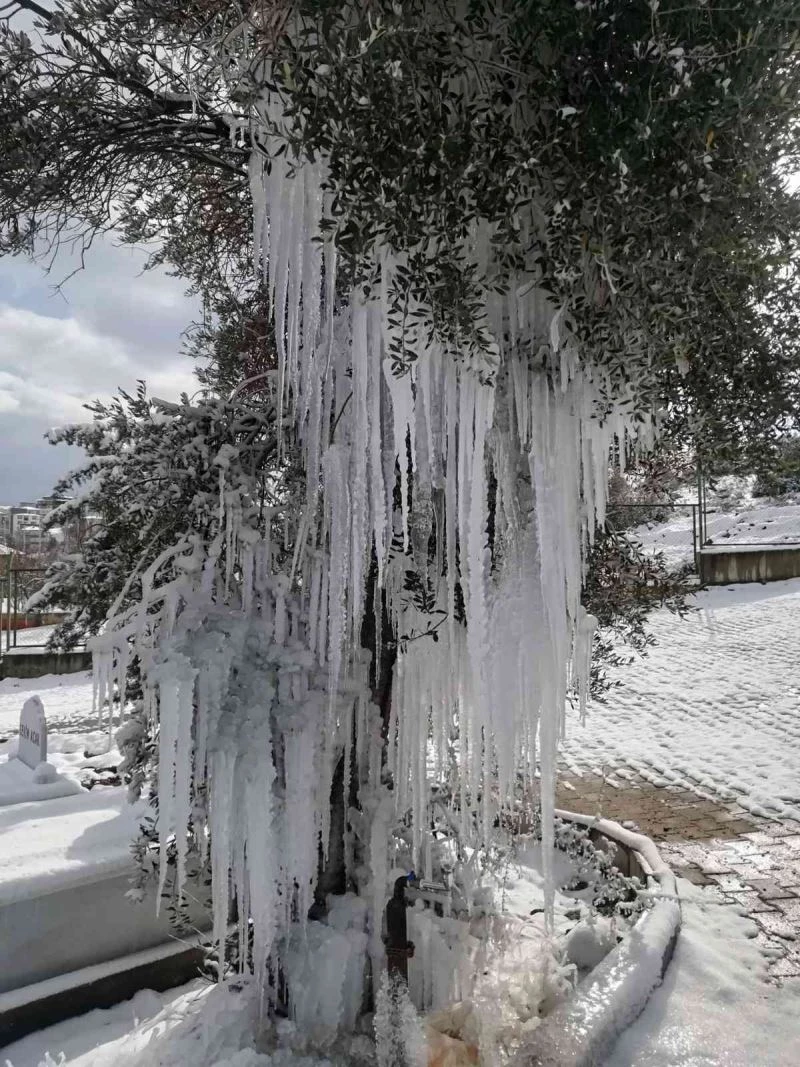 Merkezefendi ilçesi Çakmak Mahallesi Mezarlığı içerisinde bulunan çeşmenin su borusu soğuk hava nedeniyle gece yarısı patladı. Patlayan çeşmeden gece boyunca akan su buz tuttu. Sıcaklığın sıfırın altında eksi 4 dereceye kadar düşmesi nedeniyle yavaş yavaş donarak zeytin ağacını kapladı. Buz sarkıtları oluşan ağaçta, ilginç görüntü oluşturdu. Bir vatandaş ise durumu cep telefonu kamerası ile kayıt altına alarak görüntüledi.