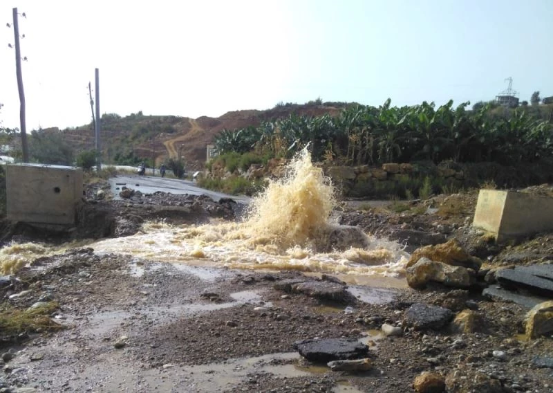 Dev su borusunun patlamasıyla yolda kocaman çukur meydana geldi. Yol kullanılamaz hale gelirken, patlayan borudan çıkan suyla araçlar sular altında kaldı, ev ve seraları su bastı. Bir çiftçinin, avokado, nar, narenciye gibi ağaçları da köklerinden söküldü.