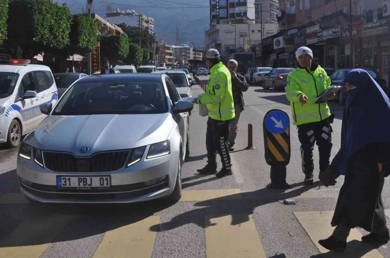 Hatay’ın Payas İlçe Emniyet Müdürlüğüne bağlı Trafik Denetleme Şube Müdürlüğü ekipleri, Atatürk Caddesi üzerinde uygulama yaptı. Ekipler, sürücülere emniyet kemeri, kask kullanımı, yaya önceliği, hız kuralları ve cep telefonu kullanımıyla ilgili bilgilendirme yaparak, broşür dağıttı.