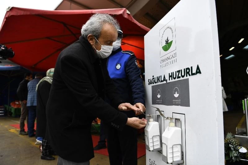 Osmangazi Belediyesi, pazar yerlerindeki tedbirleri en üst seviyede tutmak adına ilçede bir hafta süresince kurulan 54 pazar yerinin her biri için bir zabıta komiserini yönetici olarak atadı. Atanan yöneticiler ve zabıta ekipleri, pazarlardaki tezgâhları tek tek dolaşarak, maskelerini çene altında tutan esnaf ve vatandaşlara yönelik uyarılarda bulunuyor. Ekipler, maskelerin ağız ve burnu kapatacak şekilde takılmasının gerekliliği konusunda esnaf ve vatandaşları bilinçlendiriyor.