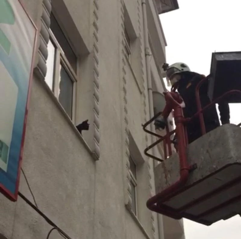 Pencere önünde mahsur kalan kediyi itfaiye kurtardı