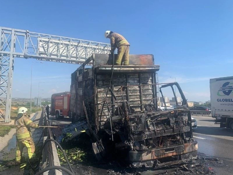 Olay, Pendik’te TEM otoyolu Edirne istikametinde saat 15.50 sıralarında meydana geldi. Yolda ilerleyen meyve sebze yüklü kamyon, lastiğinin patlamasının ardından alev aldı. Teker kısmından yükselen alevleri fark eden sürücü İlker Aşar kamyonu yolun kenarına çekti. Kamyon kısa sürede alevlere teslim olarak kullanılamaz hale geldi. Kasadaki meyve ve sebzeler de yangında zarar gördü. Olay yerine sevk edilen itfaiye ekipleri yangını söndürdükten sonra kamyon kasasında bulunan ve zarar gören meyve sebzeleri boşalttı. Olayda can kaybı ya da yaralanma yaşanmadı.