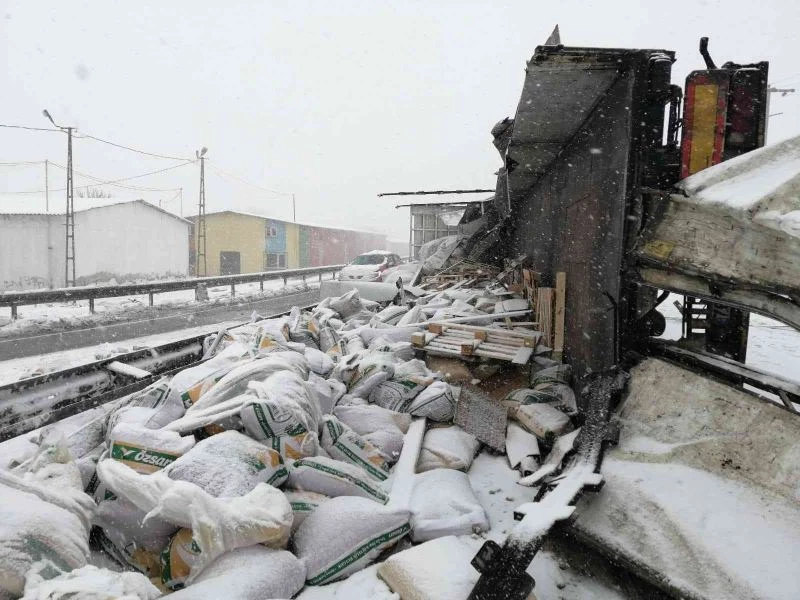 Pendik’te kuru bakliyat yüklü tır, yoğun kar yağışı nedeniyle demir bariyerleri aşarak refüje devrildi. Kazada sürücü koltuğunda sıkışan şoför, itfaiye ekiplerince çıkarılarak hastaneye kaldırıldı.
