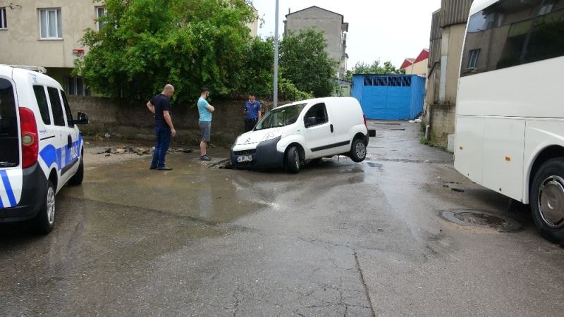 Pendik’te yoğun yağmur yağışı nedeniyle yollar adeta göle döndü. Suyun sel gibi aktığı yol üzerinde park halindeki bir araç suda sürüklenerek başka bir araca çarptı. Başka bir aracın tekeri ise yol üzerinde oluşan çöküntüye saplandı.