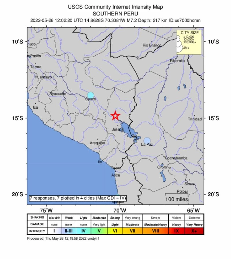 Peru’nun güneyinde 7.2 büyüklüğünde deprem meydana geldi.