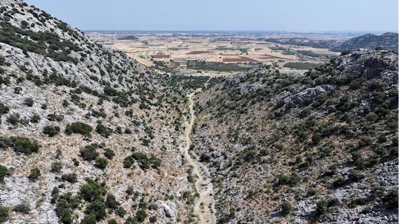 Antik yol ve çevresindeki obruk ve tarihi yapılardan oluşan güzel manzara dron ile görüntülendi.