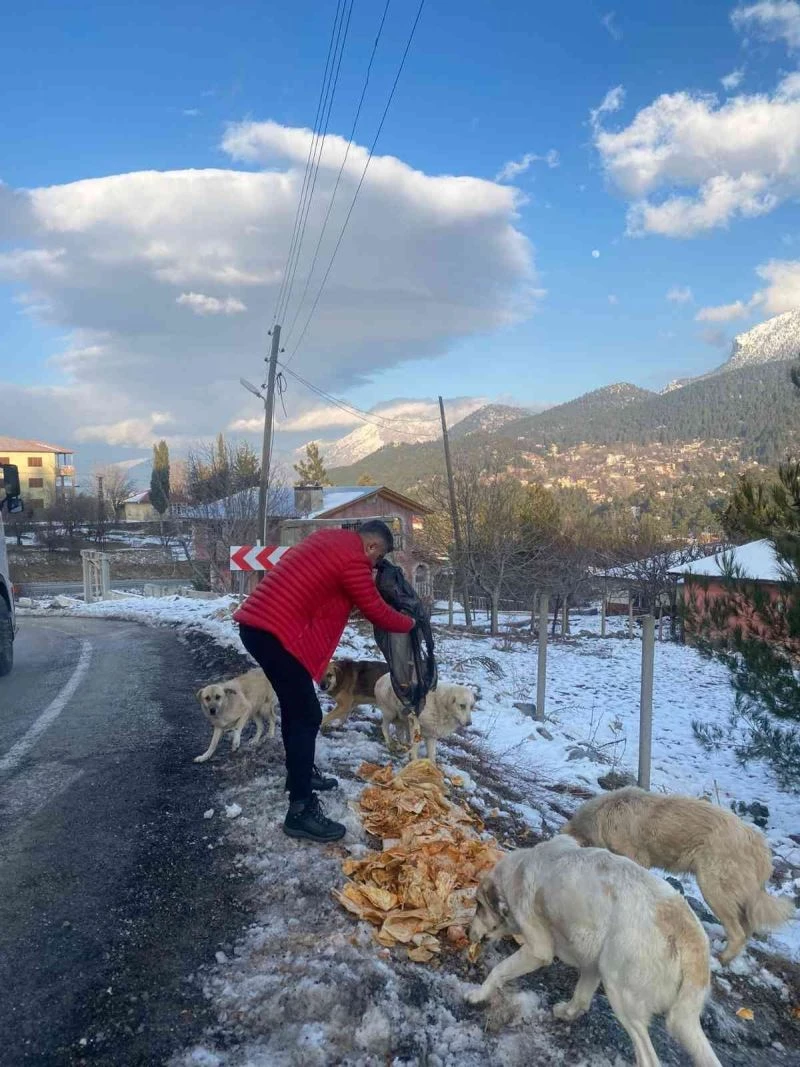 Kentte dönercilik yapan ‘Piton döner’in sahibi Mehmet İkram Taş, Pozantı ilçesine giderek kar yağışı nedeniyle yiyecek bulmakta zorlanan sokak köpeklerini besledi.