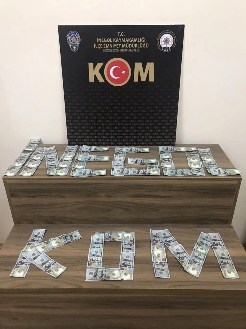 Piyasaya sahte dolar sürmeye çalışan Memduh T. isimli şahıs, İnegöl ilçesi İnegöl KOM Grup Amirliği ekipleri tarafından yapılan operasyon sonucu yakalandı. Şüphelinin ikametinde yapılan aramalarda, 62 adet 100 dolar olmak üzere toplamda 6 bin 200 sahte Amerikan doları ele geçirildi.