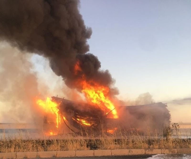 Mardin’in Nusaybin ilçesinde seyir halindeki plastik boru yüklü kamyon yandı.
