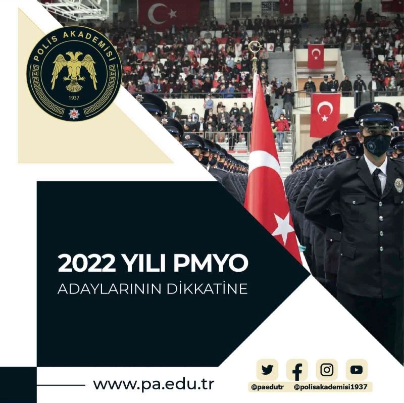Polis Akademisi Başkanlığı, 2022-2023 eğitim-öğretim yılı için polis meslek yüksekokullarına (PMYO) giriş sınavı duyurusunu yayımladı. PMYO’ya yeni eğitim öğretim yılında 2 bin erkek, 500 kadın olmak üzere toplam 2 bin 500 öğrenci alımı yapılacak.