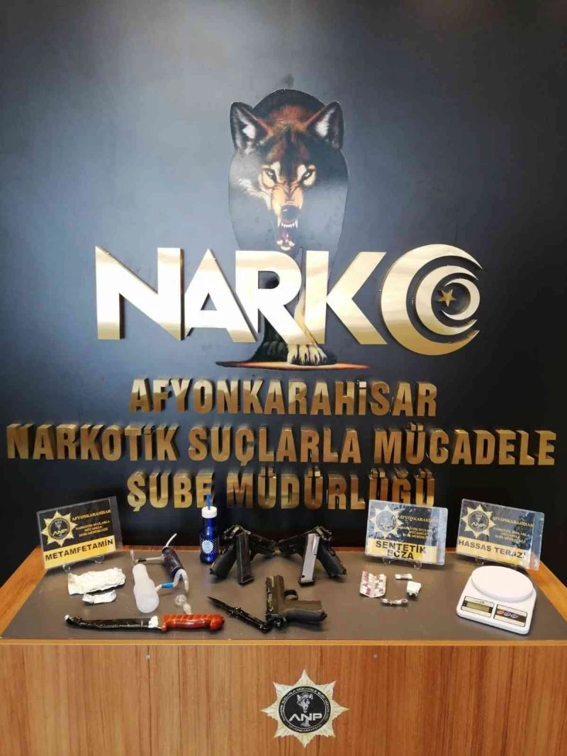 Afyonkarahisar İl Emniyet Müdürlüğü Narkotik Suçlarla Mücadele Şube Müdürlüğünce sokak satıcılarına yönelik yapılan çalışmalarda, hakkında bir çok uyuşturucu kaydı bulunan A.E.D. isimli şahıs araç içerisinde görüldü. Cumhuriyet Savcılığının talimatı ile yapılan araç aramasında ve şahıslar ile yapılan görüşme sonrası ikametlerde yapılan arama yapıldı. Yapılan aramalarda; 3 adet tabanca, 1 adet hassas terazi, 4,15 gram metamfetamin, 21 adet sentetik ecza, 1 adet bıçak ve çok sayıda uyuşturucu içme aparatı ele geçirildi. Olayla ilgili olarak; A.E.D., Y.G. ve F.Ö. isimli şahıslara Uyuşturucu Madde Kullanmak ve Polise Mukavemet suçlarından adli işlem yapıldığı bildirildi.
