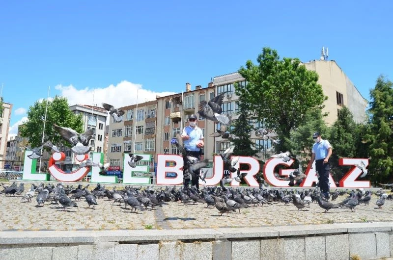 Kırklareli’nin Lüleburgaz ilçesinde görev yapan bisikletli polis timi olan “Martı” timleri, sokağa çıkma kısıtlamasında can dostları unutmadı. Martı timleri, kısıtlama boyunca ilçenin simgesi Kongre Meydanı’ndaki güvercinleri besledi.