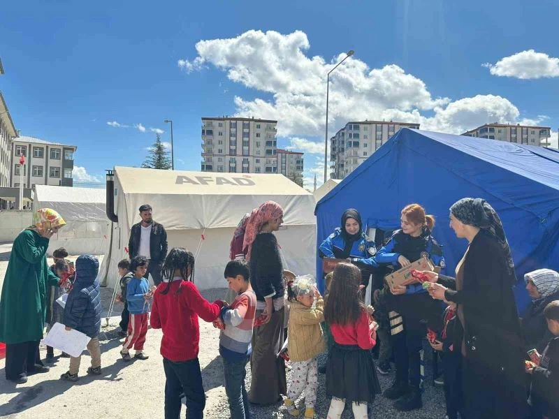 Bu çerçevedeki çalışmalarını sürdüren ekipler kent merkezindeki konteyner ve çadır kentleri ziyaret ederek çocuklara çeşitli hediyeler dağıtıp onların mutlu olmalarını sağlıyor.
