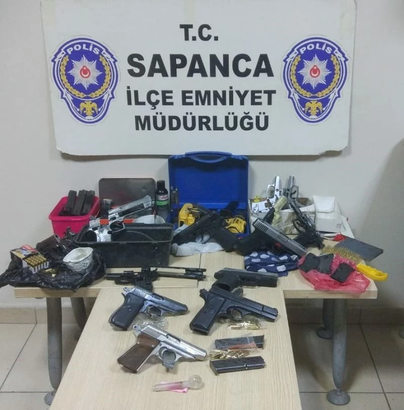 Alınan bilgiye göre, Sapanca İlçe Müdürlüğü ekipleri, ilçenin huzur ve güvenliği için denetimlerini sürdürüyor. Bu doğrultuda Uzunkum Mahallesi mevkiinde gerçekleştirilen denetimlerde içerisinde H.G., A.V.K., C.S., C.K. ve O.Ş.’nin bulunduğu araç durduruldu. Araç içerisinde yapılan aramada ise 3 adet ruhsatsız tabanca, 70 adet tabanca fişeği, 3 adet tabanca namlusu, 12 adet tabanca şarjörü, 3 adet kurusıkı tabanca, 5 adet tabanca iskeleti, Muhtelif sayıda silah yapımında ve tamiratında kullanılan malzeme, 1 adet uyuşturucu madde içiminde kullanılan cam materyal ele geçirildi. Polis ekipleri 5 kişiyi polis merkezine götürerek konuya ilişkin inceleme başlattı.