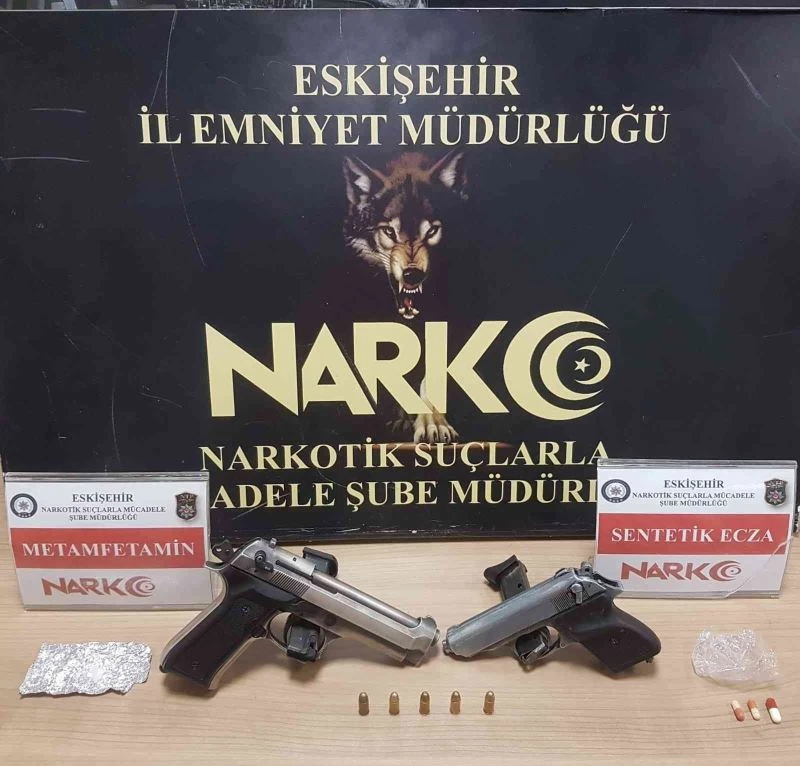 Edinilen bilgilere göre, İl Emniyet Müdürlüğü’ne bağlı Narkotik Suçlarla Mücadele Şubesi ekiplerince Odunpazarı İlçesi’nde çalışmada yapıldı. Çalışmalar kapsamında yapılan aramalarda 0,39 gram metamfetamin, 3 adet sentetik ecza hap ve 2 adet ruhsatsız tabanca ile 5 adet mermi ele geçirildi.