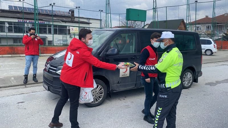 Düzce’de polis ekipleri korona virüs salgını sonrasında uygulanan hafta sonu sokağa çıkma kısıtlaması kapsamında D-100 karayolu Öztürkler mevkisinde uygulama gerçekleştirdi. Kısıtlamada sürücü ve yolcuların izninin olup olmadığı kontrol edilirken, güzergah üzerinde seyir halinde olan bir minibüs polis ekipleri tarafından çevrildi. Minibüs içerisinden çıkarak sürpriz yapan Kızılay ekipleri ise polislerin 10 Nisan Polis gününü kutladı. Her bir polis memuruna tek tek elleri ile hazırladıkları çikolata ve bisküvi paketi ile soda ikramı yaptı. Sürpriz karşısında mutlu olan polis ekipleri, Kızılay ekiplerine günlerini unutmadıkları için teşekkür etti.