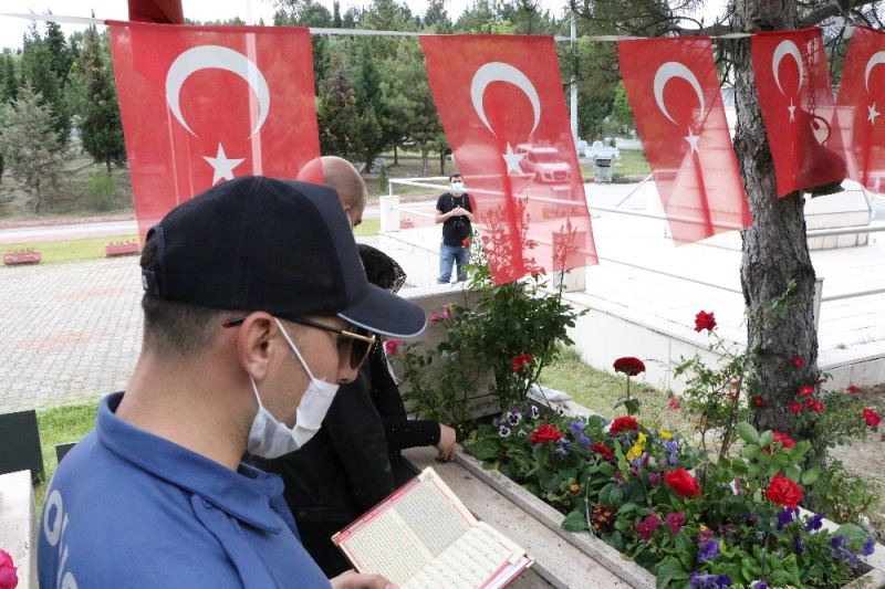 Karabük’te, Ramazan Bayramı’nın 1. günü nedeniyle şehitliğe gelen şehit polis memuru Ercan Hırçın’ın annesi oğlunun mezarında gözyaşı dökerken, polis memuru da Kur’an-ı Kerim okudu.