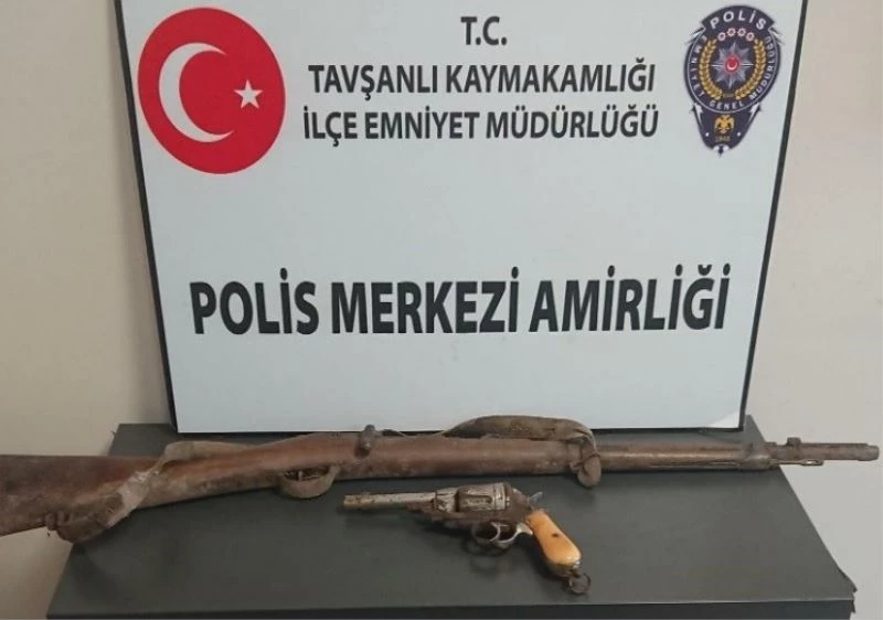 Kütahya’nın Tavşanlı ilçesinde polisin durdurduğu araçta tarihi eser niteliğinde bir tüfek ve silah ele geçirildi.Tavşanlı Otogar’da yapılan kontrollerde 43 BF 994 plakalı araç şüphelenilerek durdurulmuş araçta bulunan Sefa E.(37) ve Özkan Ö. (38) olduğu görülmüş yapılan kaba üst aramasında herhangi bir olumsuzlukla karşılaşılmamış, araçta gözle görünür yerde yapılan aramada tarihi eser olarak değerlendirilen 1 adet tüfek ve 1 adet altı patlar tabanca olduğu tespit edilmiş; şahıslar gerekli işlemler için Polis Merkezi Amirliğine götürüldü.