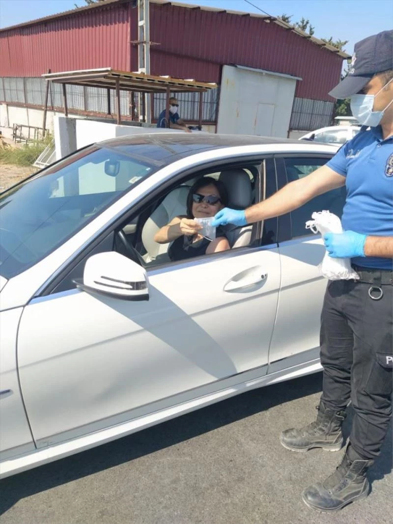 HATAY (AA) - Hatay'in Arsuz ilçesinde, polis ekipleri vatandaslara maske dagitti.