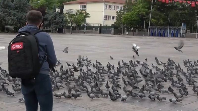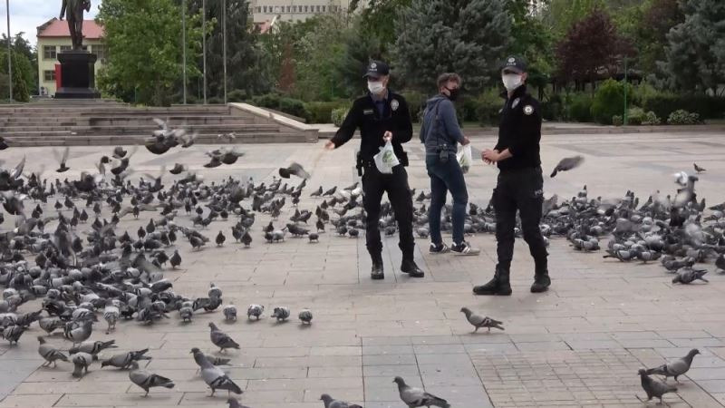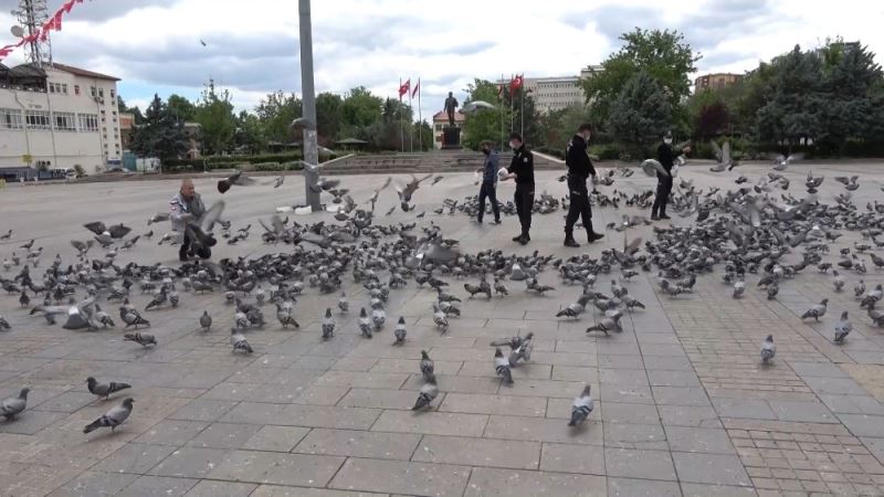 Kırıkkale’de, korona virüs (Covid-19) tedbirleri kapsamında sokağa çıkma kısıtlamasının ardından boş kalan meydan ve caddelerde görevli polis memurları ile basın mensupları, aç kalan güvercinleri besledi.