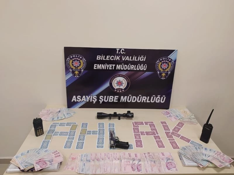 Bilecik İl Emniyet Müdürlüğü Asayiş Şube Müdürlüğü görevlilerince yapılan çalışmalarda il merkezinde bulunan bir dairede kumar oynatıldığı bilgisi aldı. İhbar üzerine hemen harekete geçen ekipler gece yarısı mahkeme kararı ile bahse konu adrese operasyon düzenledi. İçerde bulunan 10 şahsın üstlerinde ve ikamet yerinde yapılan aramada suç unsuru olarak değerlendirilen 32 bin 570 TL para, 2 adet telsiz ve aparatları, 1 adet dürbün, 1 adet kurusıkı tabanca, açılmış halde 70 adet iskambil kâğıdı ele geçirildi. Şahıslara Kabahatler Kanunu kapsamında toplamda 10 bin 688 TL idari yaptırım uygulanırken, bahse konu adreste Hıfzıssıhha Kanunu gereğince idari işlem ve bir şüpheli şahsa “Kumar Oynanması için Yer ve İmkân Sağlama” suçundan, 1 şüpheli şahsa da 6136 Sayılı Kanuna muhalefet suçundan adli işlem yapıldı.