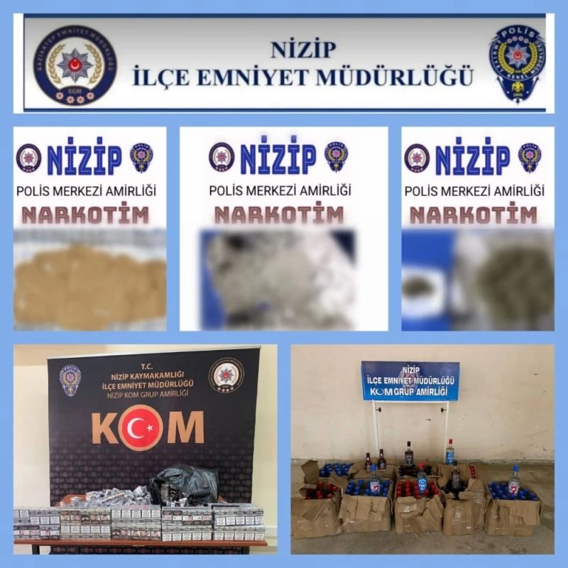 Gaziantep Emniyet Müdürlüğüne bağlı Nizip İlçe Emniyet Müdürlüğü ekipleri, durumundan şüphelenildiği 1 araçtan 600 paket gümrük kaçağı sigara, 2 işyerinden 186 şişe gümrük kaçağı alkol ile 13 pet şişe dökme içki ve 2 şahıstan bir miktar uyuşturucu madde ele geçirdi. Ele geçirilen suç unsurları ile ilgili 7 şüpheli yakalanarak gözaltına alındı. Ekipler, ayrıca çeşitli suçlardan yakalama emri ile aranan 4 şahıs yakalanmış, yakalanan şahıslar hakkında adli soruşturma başlatıldı.
