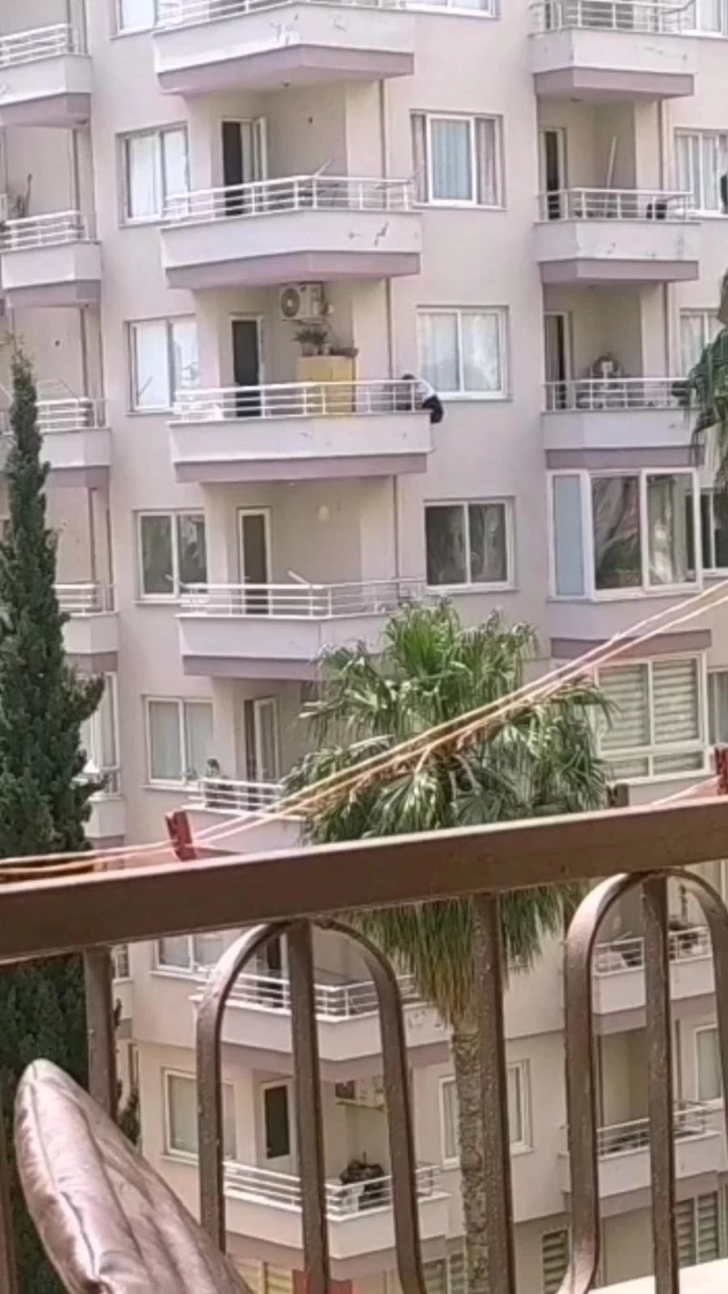 Mersin’de çeşitli suçlardan aranması bulunan bir şahıs, evine gelen polisten kaçmak için canını hiçe saydı. 6’ncı katta bulunan evlerinin balkonundan sarkarak 5’inci kata inen şüpheli, polisten kaçamadı. Şüphelinin balkondan balkona inme anları ise bölgede bulunan bir vatandaş tarafından cep telefonu kamerasıyla görüntülendi.