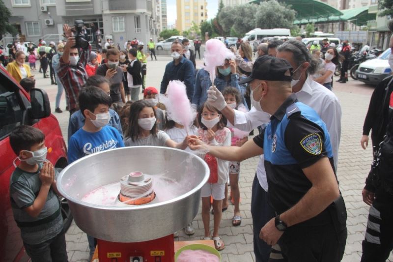 Adana polisi mahalle mahalle gezerek, "Bugün Bayram" şarkısı eşliğinde çocukların bayramını kutlayıp onlara pamuk şeker dağıttı.