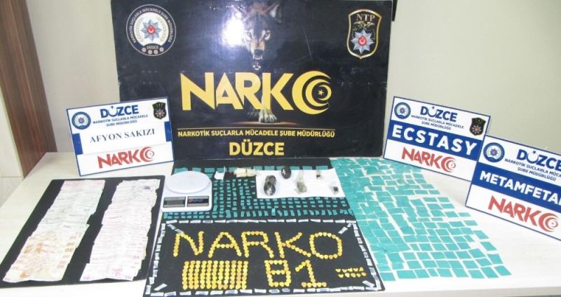 Düzce İl Emniyet Müdürlüğü Narkotik Suçlarla Mücadele Şube Müdürlüğü ekiplerince, Cumhuriyet Başsavcılığı koordinesinde yürütülen çalışmada, Camikebir Mahallesi’nde uyuşturucu madde ticareti yaptığı tespit edilen 2 şüpheli yakalandı. Yakalanan şüphelilerin üzerinde ve ikametlerinde yapılan aramalarda 240 adet extacy hap, 5 gram extacy hap parçaları, 2 parça halinde 1,5 gram metamfetamin maddesi, 193 parça 290 gram afyon sakızı, 1 adet hassas terazi, suçtan elde ettiği değerlendirilen 3 bin 735 TL para ve uyuşturucu paketlemek için kullanılan bir tomar yeşil renkli naylon poşet ele geçirildi.